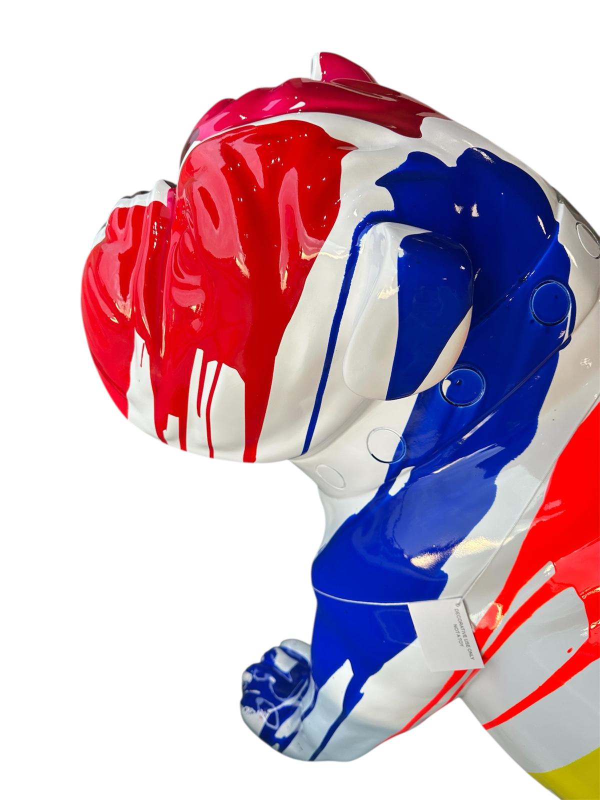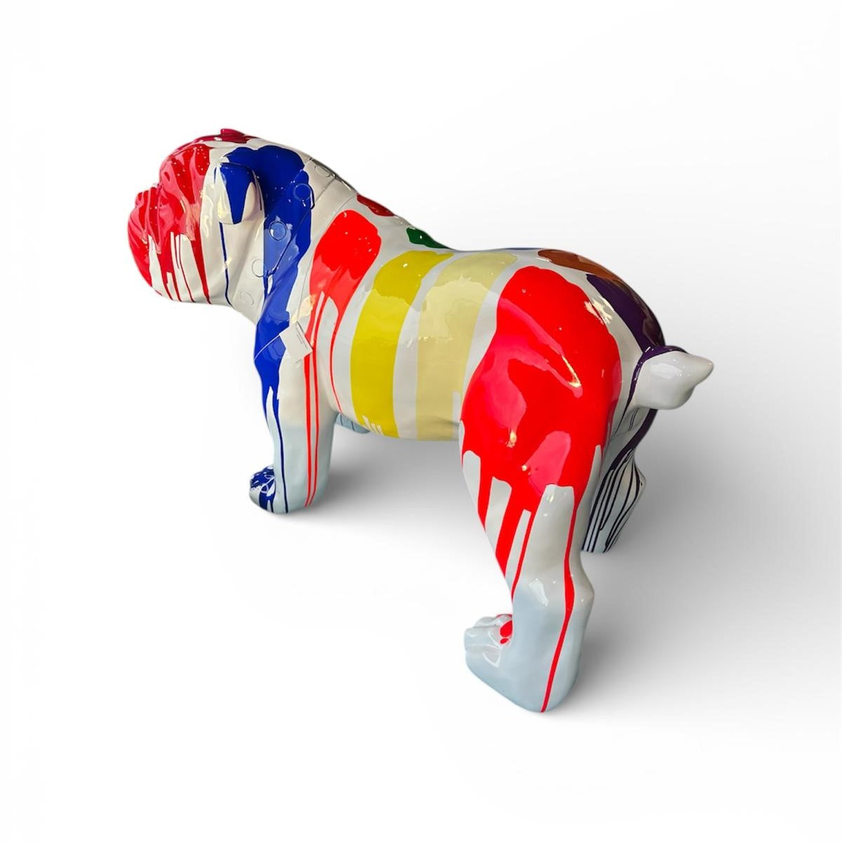 Scultura decorativa a forma di cane bulldog con un design che presenta colature di vernice multicolore. Realizzata in poliresina, un materiale resistente e leggero. La finitura è laccata, il che conferisce un aspetto lucido e moderno. E' un pezzo di arredamento originale pensato per aggiungere un tocco di colore e allegria