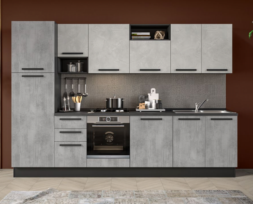 Cucina lineare l. 315 cm, h. 216 cm completa di cappa a incasso, lavello, forno statico, frigo 209 l. pc 4 fuochi a gas e anta rallentata. Anta ossido e spatolato, struttura color antracite, maniglia Pitty