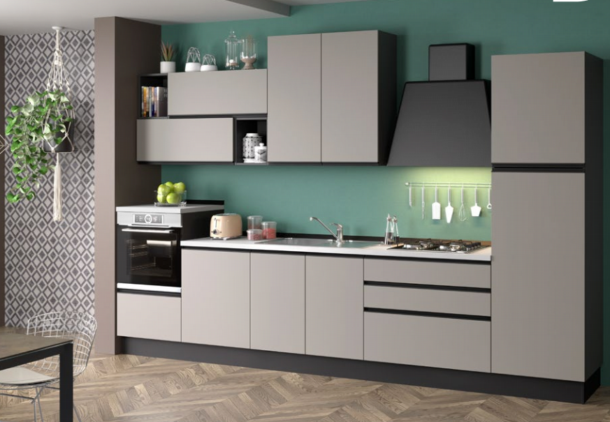 Cucina lineare l. 360 cm, h. 216/240 cm completa di cappa antracite, lavello, forno statico, frigo 209 l. pc 4 fuochi a gas e anta rallentata. Anta tortora , struttura color antracite, maniglia incassata alluminio