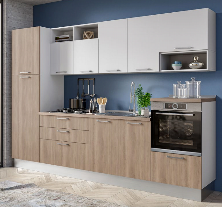 Cucina lineare l. 300 cm, h. 216 cm completa di cappa a incasso, lavello, forno statico, frigo 209 l. pc 4 fuochi a gas e anta rallentata. Anta olmo e spatolato , struttura color bianca, maniglia Arco