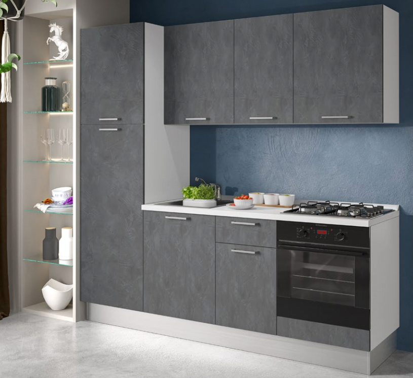 Cucina lineare l. 255 cm, h. 216 cm completa di cappa a incasso, lavello, forno statico, frigo 209 l. pc 4 fuochi a gas e anta rallentata. Anta iron , struttura bianca, maniglia triangolo.