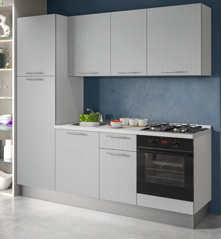 Cucina lineare l. 255 cm, h. 216 cm completa di cappa a incasso, lavello, forno statico, frigo 209 l. pc 4 fuochi a gas e anta rallentata. Anta canyon , struttura bianca, maniglia tubetto inox
