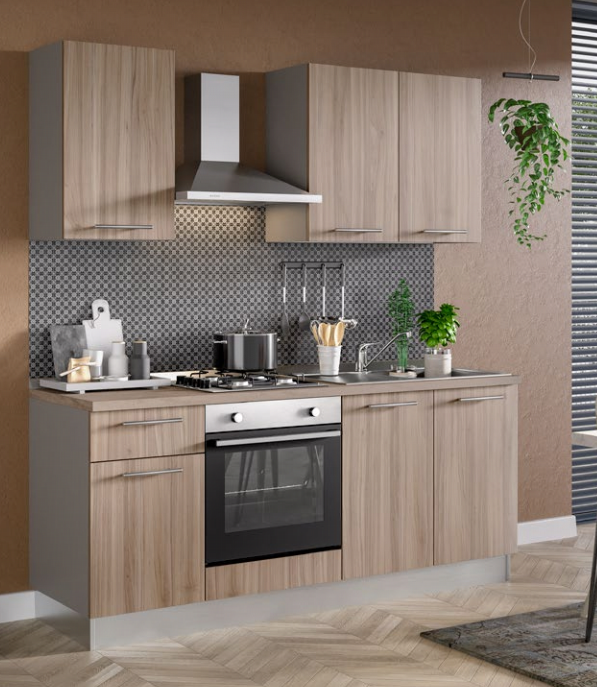 Cucina lineare l. 195 cm, h. 216 cm completa di cappa inox, lavello, forno statico, pc 4 fuochi a gas e anta rallentata. Anta noce chiaro, struttura tortora, maniglia tubetto inox