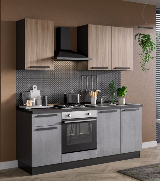 Cucina lineare l. 195 cm, h. 216 cm completa di cappa nera, lavello, forno statico, pc 4 fuochi a gas e anta rallentata. Anta ossido e noce chiaro, struttura antracite, maniglia Pitty