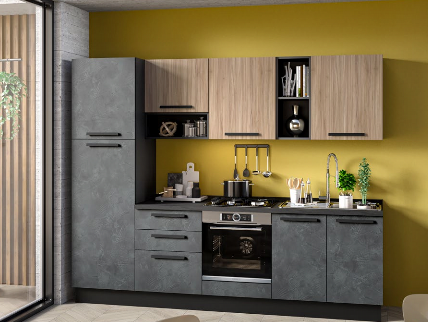 Cucina lineare l. 270 cm, h. 216 cm completa di cappa a incasso, lavello, forno statico, frigo 209 l. pc 4 fuochi a gas e anta rallentata. Anta iron e noce chiaro, struttura color antracite, maniglia Pitty