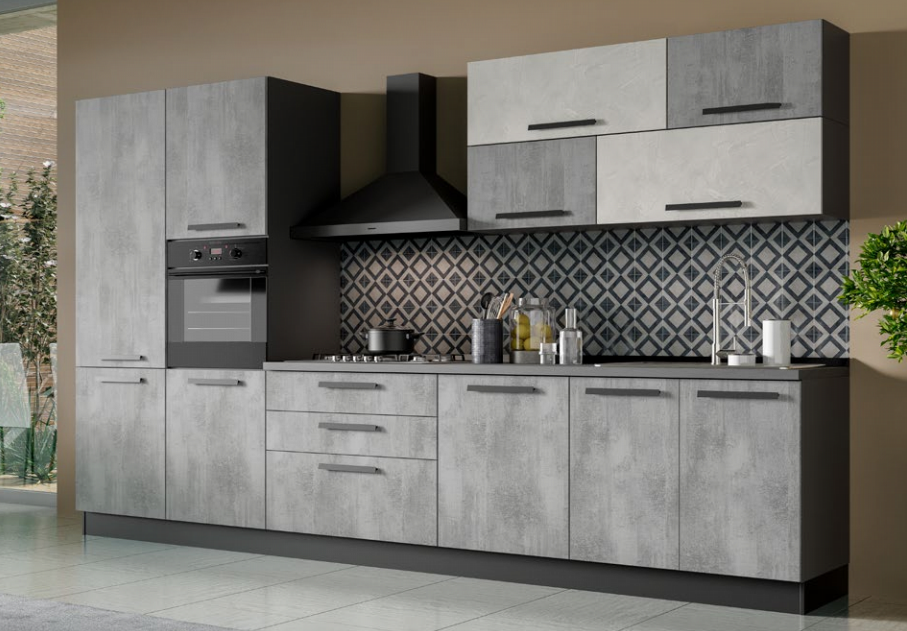 Cucina lineare l. 360 cm, h. 216 cm completa di cappa nera, lavello, forno statico, frigo 209 l. pc 4 fuochi a gas e anta rallentata. Anta ossido e spatolato, struttura color antracite, maniglia Pitty