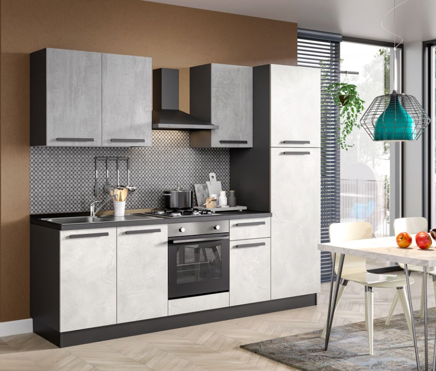 Cucina lineare l. 255 cm, h. 216 cm completa di cappa nera, lavello, forno statico, frigo 209 l. pc 4 fuochi a gas e anta rallentata. Anta ossido e spatolato, struttura color antracite, maniglia Pitty