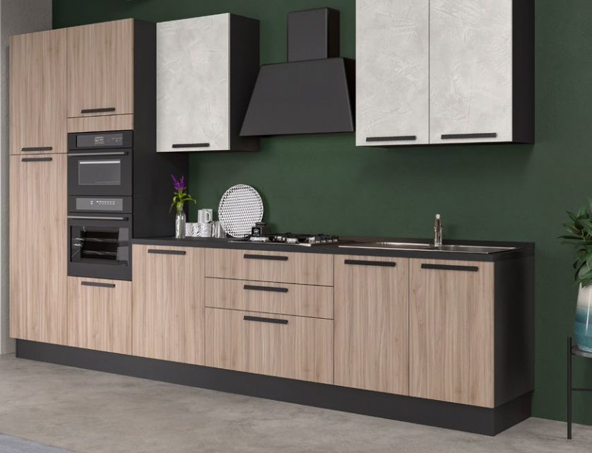 Cucina lineare l. 360 cm, h. 240 cm completa di cappa antracite, lavello, forno statico, frigo 209 l. pc 4 fuochi a gas e anta rallentata. Anta noce chiaro e spatolato, struttura color antracite, maniglia Pitty