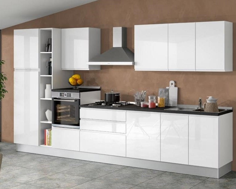 Cucina lineare l. 390 cm, h. 216 cm completa di cappa inox, lavello, forno statico, frigo 209 l. pc 4 fuochi a gas e anta rallentata. Anta bianco lucido, struttura color bianco, maniglia presa a J su anta