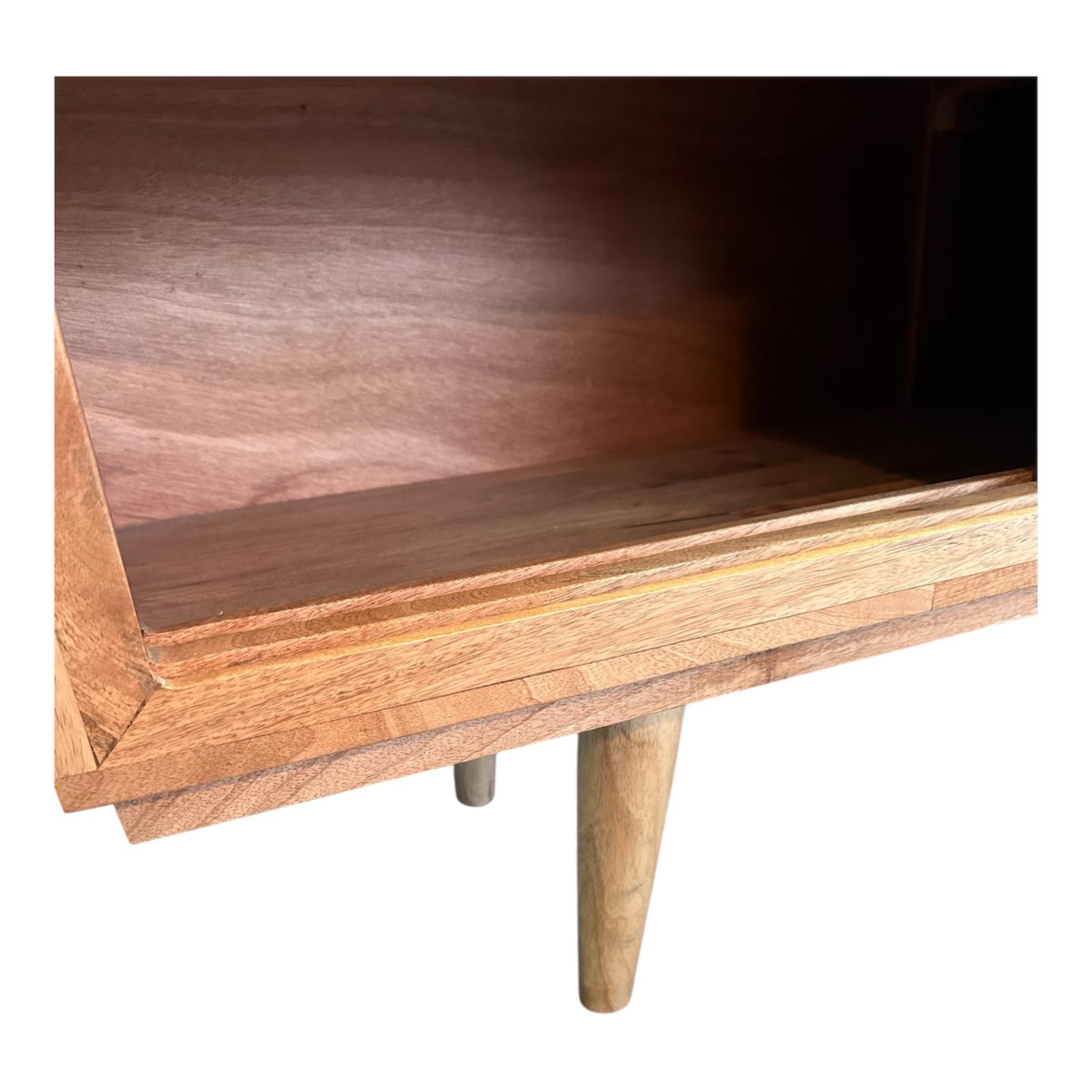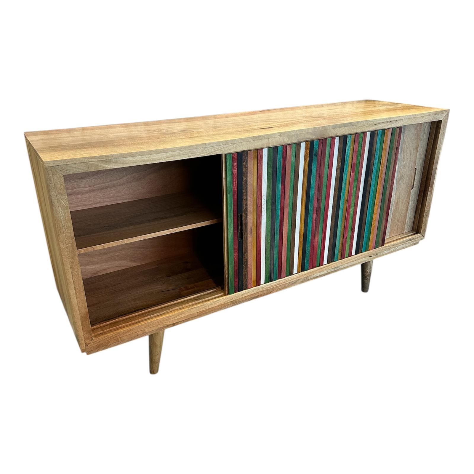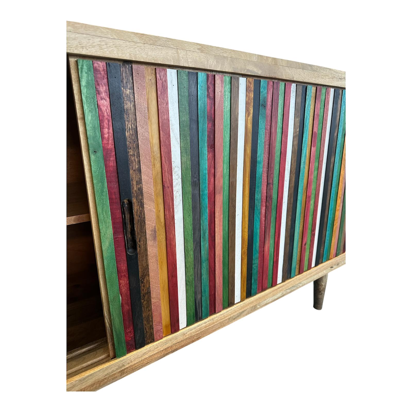 Per organizzare in maniera ottimale lo spazio, è stata creata la madia con scocca in massello di Mango naturale, ante in legno di mango scorrevoli, una in legno naturale, l'altra decorata con strisce verticali multicolori; piedi a spillo in massello di mango. L'interno e i ripiani sono in massello.