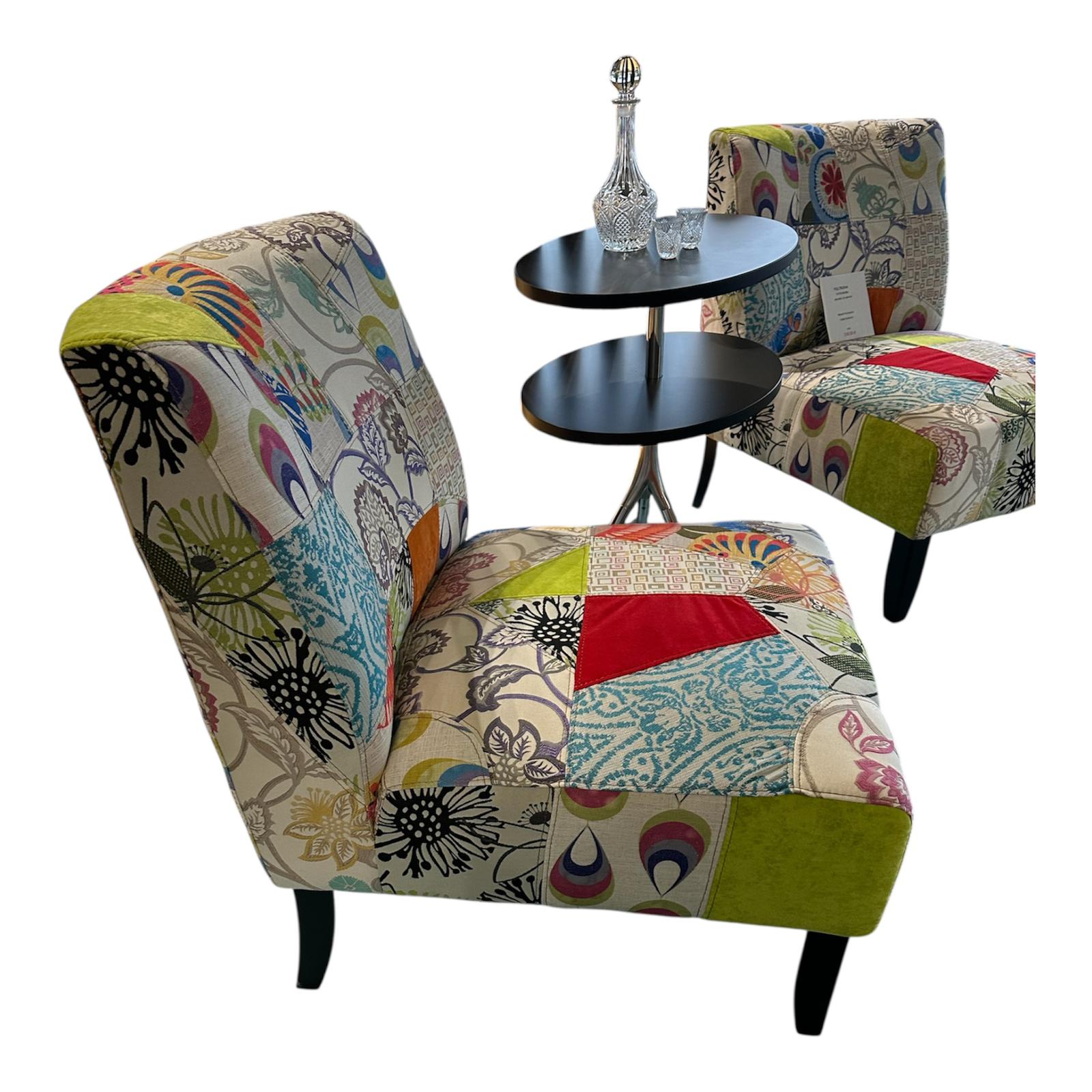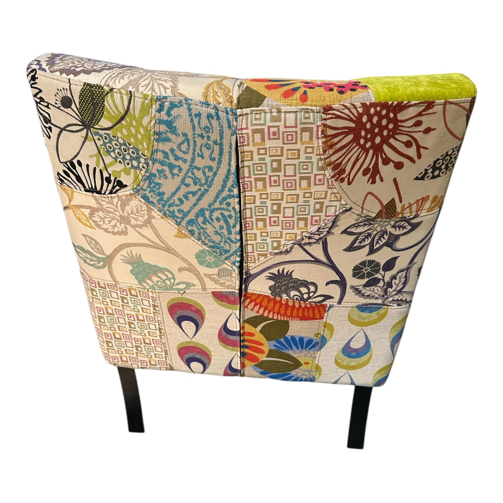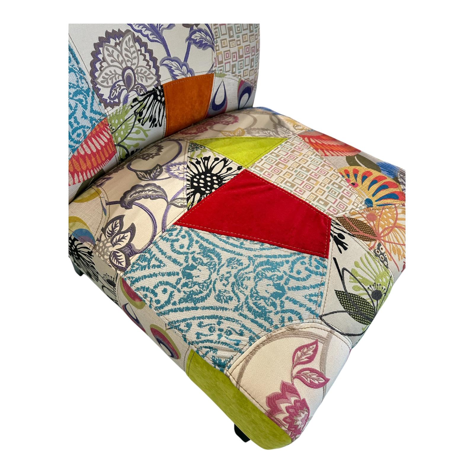 Poltrona senza braccioli in tessuto patchwork multicolore, ideale per aggiungere un tocco di colore e un design vivace a qualsiasi ambiente. La poltrona è rivestita con un tessuto che combina vari motivi, fantasie e colori, creando l'effetto patchwork. Struttura in legno, rivestimento in tessuto.